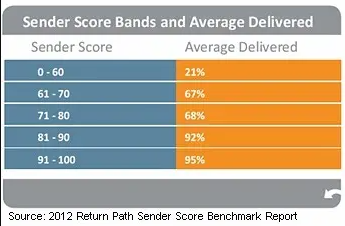 信誉度的作用有多大呢?据世界上最大的第三方信誉评估机构ReturnPath的报告,如果满分是100分,送达的情况是这样的: