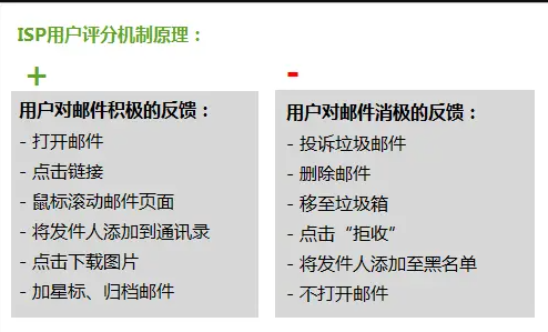 通过这张图可以看出,如果用户对你的邮件反馈是积极的,比如,打开邮件、点击链接、归档、标星等,ISP会认为你是一个可靠的发件人,对于你后续发送的邮件,ISP更愿意放在收件箱。如果收件人对你的邮件反馈是消极的,比如,点击ISP投诉、删除邮件、移至垃圾箱等,ISP会据此判断你很可能是一个不受欢迎邮件的发送者,将后续邮件放入垃圾箱或被屏蔽。用户在ISP的投诉会对收件箱接收率造成严重影响,甚至造成发送地址及域名进入ISP的黑名单。